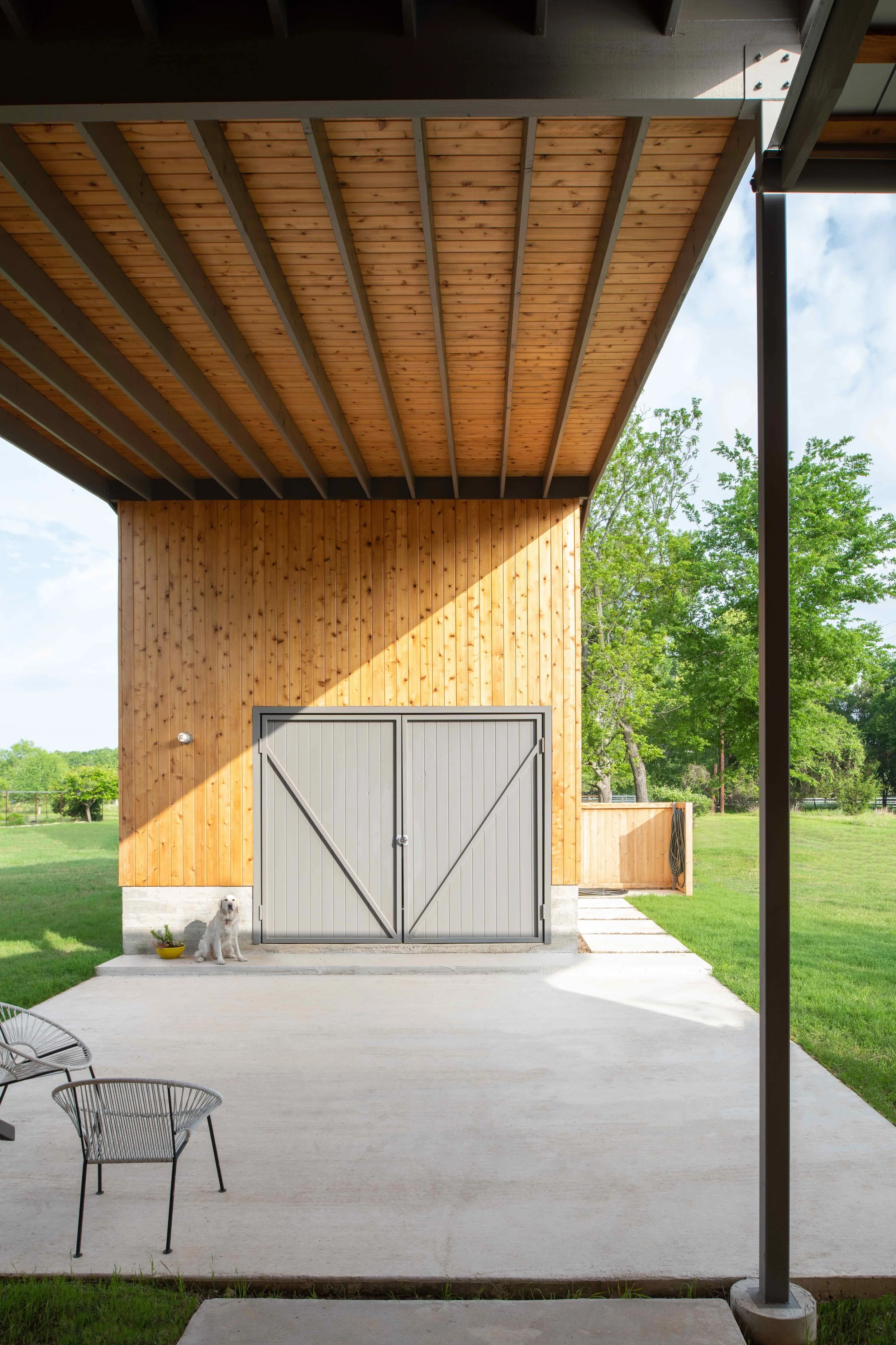 The 2,000 sf, 2-bedroom and 2-½ bath house replaced a family home destroyed by the 2015 Blanco River flood. Raised higher, the house is well protected from future flooding while allowing much needed airflow under its structure. Large roof overhangs with exposed standing seam metal roofing and cedar soffit protect the home from the Hill Country’s storms and summer sun. A central porte-cochère connects the main house with a garage that serves as a workshop. This home was designed to embrace its surrounding landscape, with evenly spaced windows offering open views to the adjacent river the surrounding trees. Its sawtooth roofline mimics the movement of the landscape and river. The house, clad with locally sourced cedar and limestone, reinforces its connection to its surroundings..